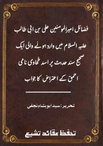 نہیں جو اسکی تحریر کاجواب دیا جاتا، مگر ہم نے اس موقع کوغنیمت سمجھا کہ اسکے سبب ان اصول و قوانین کا ذکر کر دیں تاکہ اب اگر کوی حنفی فضائل اہلبیت علیہم السلام میں وارد کسی حدیث پر کلام کرے تو شیعہ طفل مکتب اسکو ذلت و رسوائی کےاس گڑھے میں ڈھکیل آئیں جہاں سےنکلناممکن ہی نہ ہو ہم نے ماہ مبارک رمضان میں عدم فرصت کےسبب نہایت اختصار سے کام لیاہے پوری تحریر میں حنفی اصولوں کومد نظر رکھتےہوئے احادیث کی تصحیح کی ہے، الله سبحانہ تعالی سےدعاء ہے کہ وہ اہلبیت علیہم لسلام کےطفیل ہماری اس ادنی سی کوشش کو اپنی بارگاہ میں قبول فرمائےآمین۔