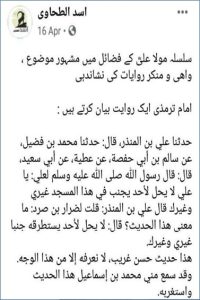 ملاحظہ فرمایا : ترمذی نےاس روایت کونقل کرکےحسن غریب ہونےکاحکم لگایا اس حدیث کو یہ ناصبی اسد حنفی موضوع منگھڑت کہ رہاہے،اور حدیث کی تشریح میں ضرار بن صرد کی رائےباطل ہے،حالت جنابت میں مسجد سے گرزنےکاحکم عام ہے اس کو امیرالمومنین علیہ السلام سے مخصوص کرنا محض بے وقوفی ہے۔
