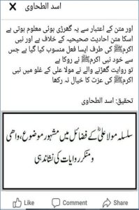 چنانچہ ایک ناصبی (اسدطحاوی) نےبھی کچھ ایسی ہی حماقت کرکےاپنی ذلت و رسوائی کا مزیدسامان فراہم کرلیا۔