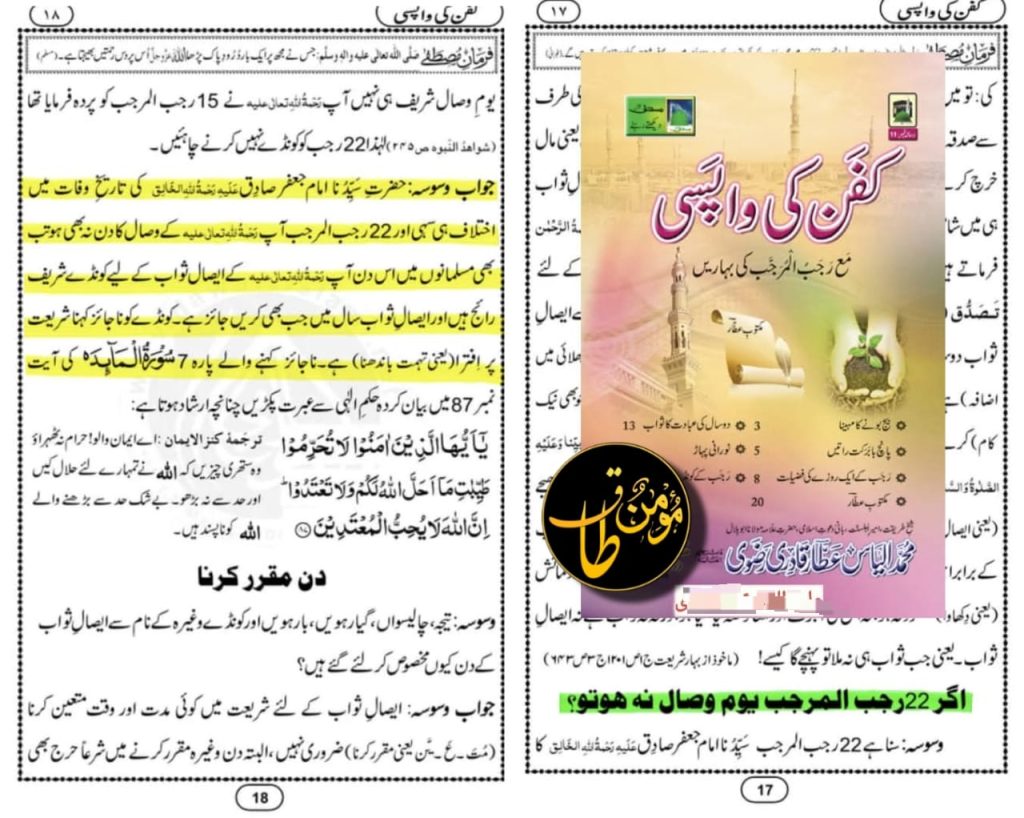 مسلمان عام طور پر ٢٢ رجب کو بالخصوص حضرت امام جعفر صادق علیہ الرحمہ کے ایصال ثواب کا اہتمام کرتے ہیں یہ شرعا بالکل جائز ہے